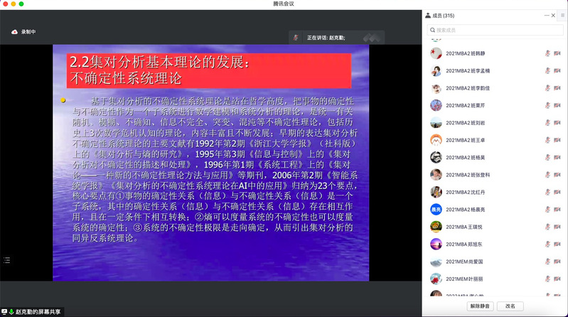 赵克勤研究员在主题报告中回顾了上世纪60年代对集合论中罗素悖论引发的第3次数学危机的思考,70年代对人生2只眼睛的猜想,80年代把自然辩证法与数学联系起来创建联系科学的梦想;综述了从1989年提出集对分析到目前为止的集对分析原理、理论、方法和广泛应用的发展进程;以基于集对分析的天气降水预报、水文水资源评价、投资风险和区域创新集对分析、不确定性智能决策的联系数建模,联系数在贝叶斯推理决策、群体智能测算、企业精准管理中的应用等等为例,说明集对分析对系统不确定性坚持“客观承认、系统描述、定量刻画、具体分析”16字方针的重要性、必要性和有效性。会后公司师生对本次报告给予了高度评价,生动而贴切实践的报告激发了员工们学习探索的热情和探讨科学的浓厚兴趣。