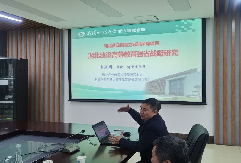 (通讯员:李慧婷、肖楠、袁怡宁)3月25日下午,湖北省政府智力成果采购项目“湖北建设高等教育强省战略研究”专家咨询暨学术研讨会在恒大永利yl23411集团举行。专家咨询与学术研讨会由湖北省普通高校人文社会科学重点研究基地湖北产业政策与管理研究中心和永利yl23411集团官网恒大永利yl23411集团主办,来自湖北省委政研室、湖北省政府研究室、湖北省教育厅、武汉大学、华中科技大学、中南财经政法大学的政策咨询专家共9人应邀参加。会议由湖北产业政策与管理研究中心主任、湖北省政府智力成果采购项目课题负责人李永周教授主持,恒大永利yl23411集团经理邓旭东教授致辞,恒大永利yl23411集团副经理童泽平教授,经理助理熊华平教授,以及研究中心研究人员邓果宇研究员、李红松教授、刘海兵副教授等参加。